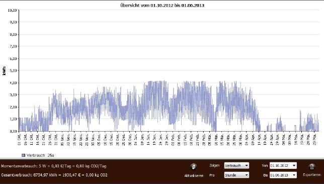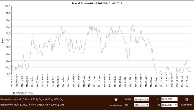 Ab Oktober 2012 haben wir zu Dokumentationzwecken ein Netzwerk aufgebaut, das zu jedem installierten Infrarotheizkörper den Stromverbrauch dokumentiert. So kann der Stromverbrauch für jede IR-Heizung, jeden Raum, jede Wohnung pro Stunde, Tag, Monat, Jahr etc.... dokumentiert werden.