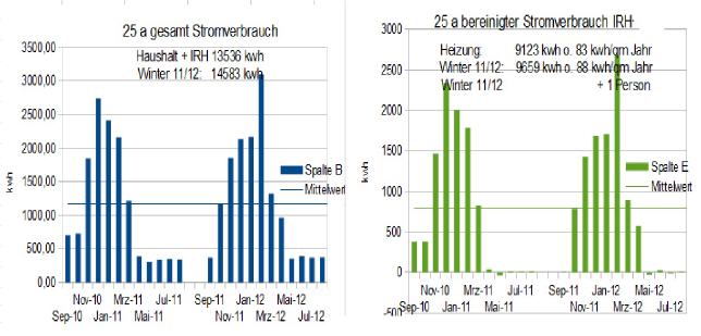 Wir haben über die Monatszählerstände seit 2010 Buch geführt. Die linke Grafik zeigt den Gesamtstromverbrauch je Monat seit September 2010 auf. In der rechten Grafik ist der Heizungsstrom anhand der Prozentwerte unserer Hilfstabelle errechnet.