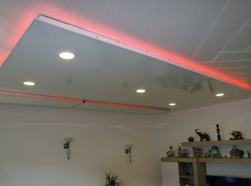Stromanschluß an der Decke für IR-Heizung und Licht muß vorhanden sein. z.B.: bisherige Lampe wird abgebaut. SunLight 300 mit eingebauten LED-Spots wird an die Decke montiert und nutzt den Stromanschluß der Lampe. Bisheriger Lichtschalter wird auf Dauerstrom geschaltet. Die Spots werden über optionale Funkschalter in der SunLight geschaltet. Der Funktaster wird über bisherigen Lichtschalter montiert. Die Heizfunktion der SunLight wird über Funkthermostat gesteuert. >>> Zusätzliches Leitung Legen an der Decke entfällt. Auch die wassergeführte Version hat indirekte Beleuchtung und obtional LED-Spots und wird vorläufig nur in der Version 300 x 150 x 5 cm angeboten, zum gleichen Preis wie die Stromversion.