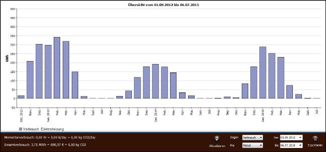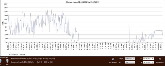 Hier hat sich die Umstellung auf die neueSunLight-Deckenheizung extrem gelohnt. Für diesen Raum hat sich nur die IR-Heizung im Okt.2013 geändert. Der Bewohner ist der gleiche wie im Jahr zuvor. Auch die Sonne kann dieses Ergebnis nicht verfälschen, da dieser Raum im Winter keine Sonneneinstrahlung hat. Die Nutzung als Experimentierraum im Winter 2014/15 ist nicht vergleichbar mit dem Vorzeitraum Auch hier hat unsere PV-Anlage im Winter ein Teil der Heizkosten auf dem Dach generiert. Dieser Anteil muß nicht zugekauft werden. |