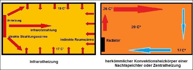 Herkömmliche Heizsysteme beheizen den Raum über die Raumluft (s. Bild u. rechts). Wände und Gegenstände im Raum bleiben kühl. Beim Lüften geht viel Wärme verloren. Die Luftfeuchtigkeit kann an den kühleren Wänden kondensieren. Dadurch entsteht ein Feuchtefilm, der einen idealen Nährboden für Schimmel und Bakterien bietet. Dabei fördert das Rotieren der Raumluft, dass immer wieder neue Luftfeuchte an kalten Stellen der Wände kondensiert. Außerdem erfordert das Rotieren und die Schichtung der Luft (unten kalt oben warm), zwangsläufig unnötig hohe Raumtemperaturen. Die Luftwalze im Raum verteilt zudem herforragend Hausstaub und sonstige allergene Stoffe.
