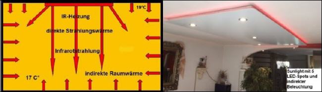 Mit unseren neuen Infrarotheizungen der nächten Generation >>> Sunlight - Deckenheizungen <<< heizen Sie jetzt nochmal ca. 30% günstiger als mit den bisherigen IR-Platten! Dies liegt an der durch niedrigere Heiz-Temperaturen, bei großer Heizfläche, effektiveren Ausnutzung der Wärmestrahlung und der Tatsache dass durch diese Platten die Luft nicht in Bewegung gesetzt wird (Konvektion). Dadurch kann die Lufttemperatur bei gleicher Behaglichkeit weiter abgesenkt werden. (ist gesund und sparsamer)