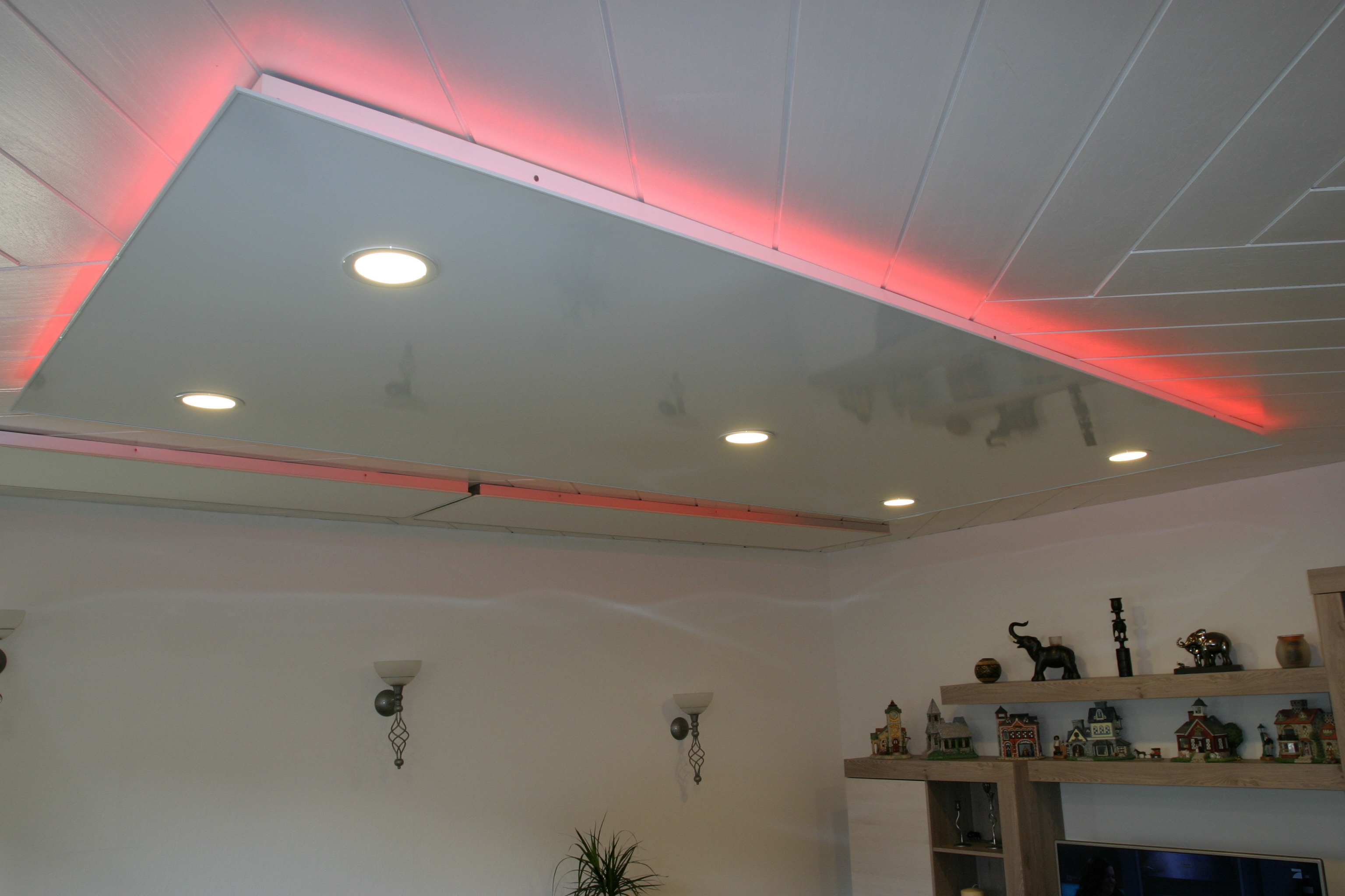 Es gibt eine neue guenstige Sunlight-Deckenheizung Typ E wie "Einfach". Es ist eine Deckenheizung mit 600 Watt und einer Groesse von 240 x 115 x 3 cm. Hier gibt es keine indirekte RGB-Beleuchtung aber LED-Spots sind moeglich, sowie auch ein definierter Durchgang fuer z.B. eine Haengelampe. (ab 775 Euro)